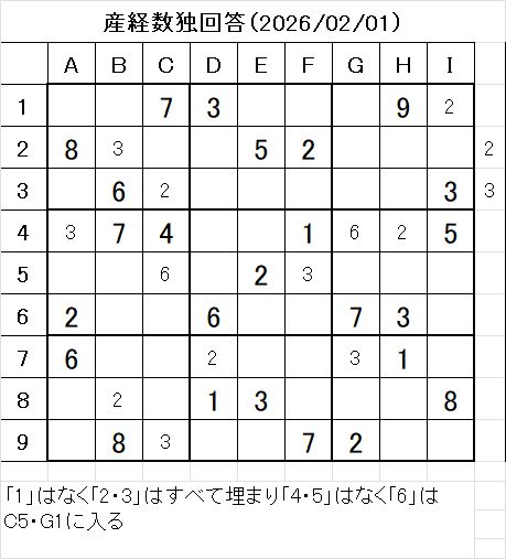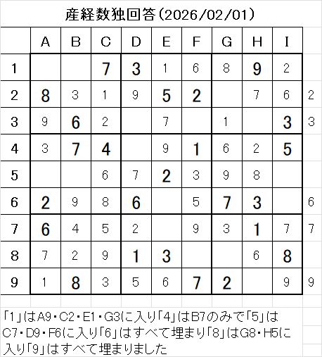 2026年2月1日掲載の産経新聞数独の問題です。