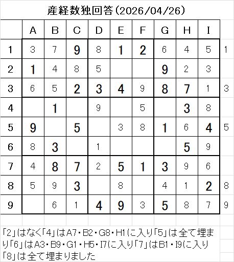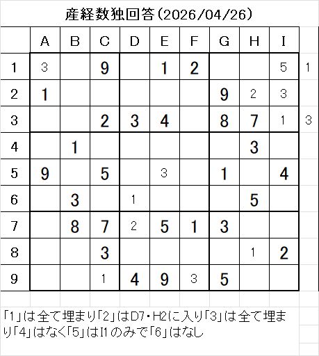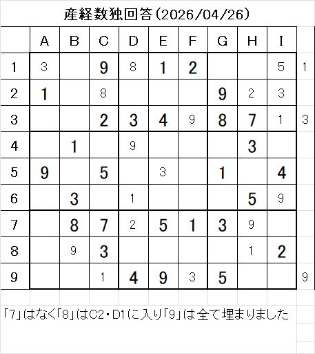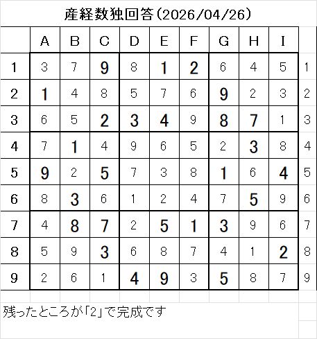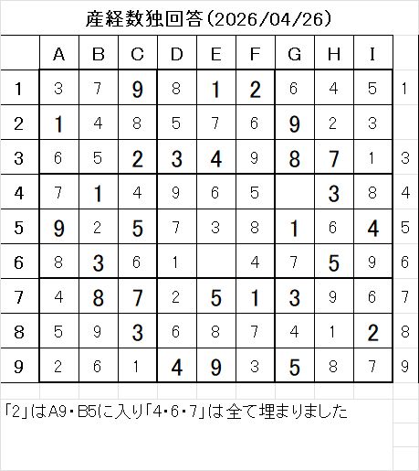 🧮 今回の「問題+答え」はこちら → 産経新聞 数独 解答 2026/4/26
